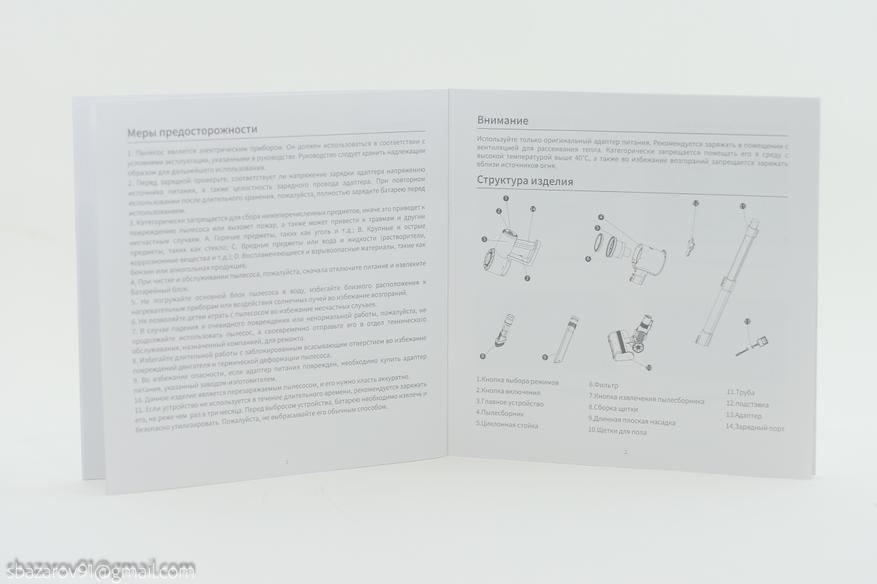 Внутри можно обнаружить множество перегородок, отделяющих элементы друг от друга. Вся комплектация выглядит следующим образом: основной корпус с контейнером для мусора и мотором, телескопическая трубка, напольная щетка, узкая щетка, щетка для ковровых покрытий, зарядное устройство, стеновое крепление и щеточка для очистки. Комплектация аналогичная другим устройствам на рынке, но более компактно размещена внутри коробки.