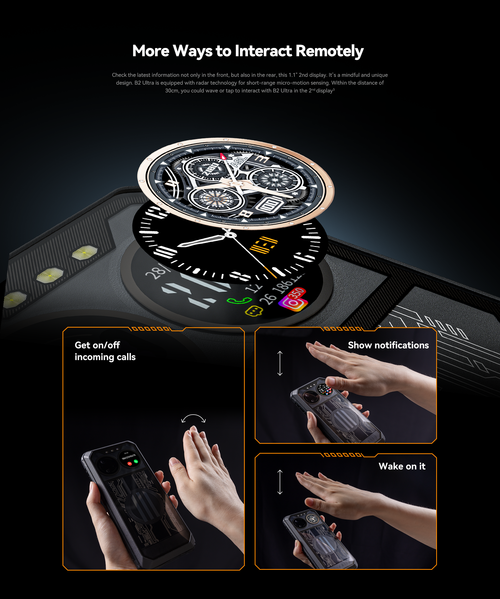 Экран защищает Corning Gorilla Glass, его диагональ равна 6,8 дюйма при разрешении 2460 × 1080 пикселей, и частоте обновления изображения 120 Гц. Сзади расположен второй экран диаметром 1,1 дюйма, разрешением 360 × 360 пикселей, на котором отображается время, прогноз погоды и уведомления. Смартфон распознаёт управление жестами.