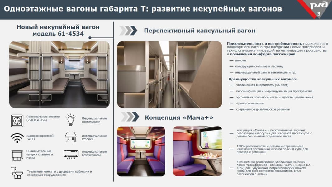 Судя по данным слайда, стандартом станет некупейный вагон модели 61-4534. В нём будут персональные розетки (как 220 В, так и USB), индивидуальные светильники, столики и воздуховоды. А ещё обещан высокоскоростной Wi-Fi и туалетные комнаты с душевыми кабинами.