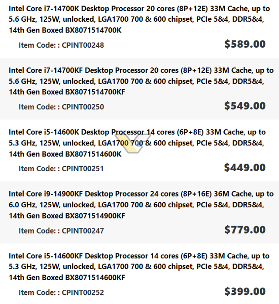 Так, Core i9-14900KF оценен в 779 канадских долларов, и это на 5% больше Core i9-13900KF в том же магазине. Стоимость Core i7-14700K – 589 канадских долларов (плюс 2%), Core i7-14700KF – 549 канадских долларов (плюс 4%), Core i5-14600K – 449 канадских долларов (плюс 7%), Core i5-14600KF – 399 канадских долларов (тут цена вообще не изменилась относительно Core i5-13600KF).