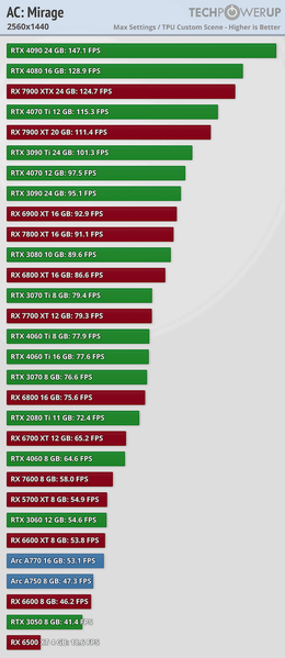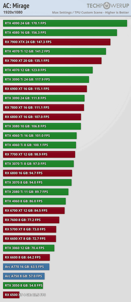 В Full HD при максимальных настройках качества даже RTX 3050 обеспечивает 55 к/с. Правда, Radeon RX 6500 XT по каким-то причинам показывает себя очень плохо. В WQHD нагрузка увеличивается не особо существенно, и 60 к/с обеспечивает даже Radeon RX 7600 или RTX 4060.