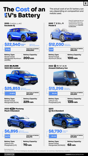 Аккумуляторные батареи являются наиболее важным компонентом электромобиля, а также самым дорогим. Компания Visual Capitalist использовала данные Benchmark Minerals Intelligence, чтобы определить, сколько будет стоить сменный аккумуляторный блок для шести существующих и для будущих электромобилей.