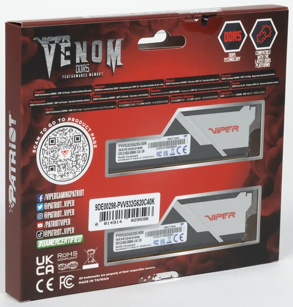- 32 ГБ (2×16 ГБ) DDR5-6200 CL40 Patriot Viper Venom (PVV532G620C40K)