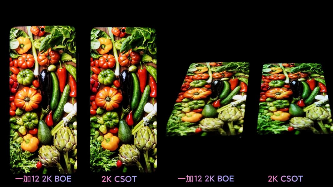 OnePlus 12 получит панель OLED BOE X1 с разрешением 3168 × 1440 пикселей. На одной из картинок ниже есть сравнение этой панели с панелью 2K CSOT. Кадровая частота составит 120 Гц, частота регулировки ШИМ — 2160 Гц.