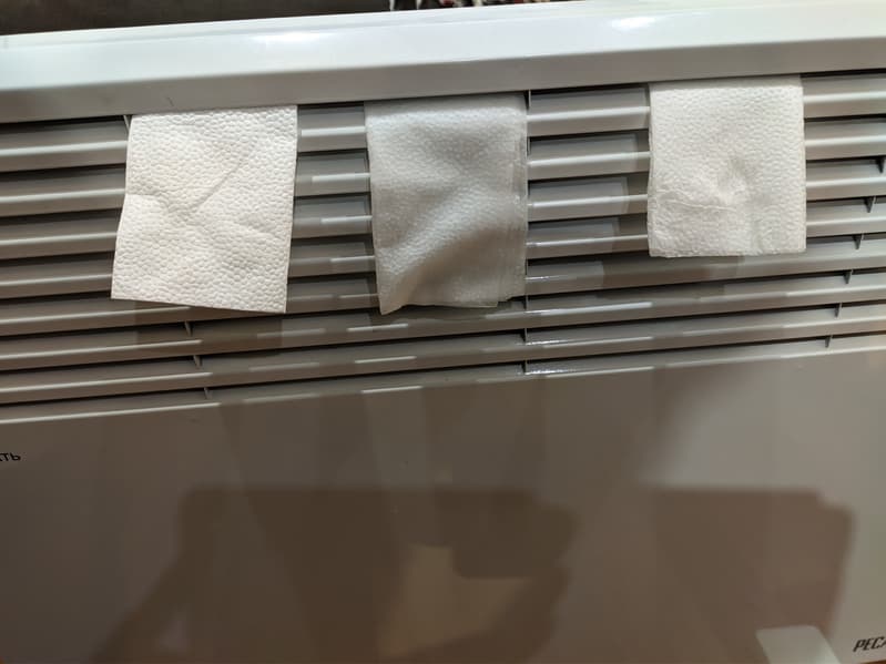 Все три салфетки мы разместили в наиболее горячей части конвекторов — в месте выхода теплого воздуха. Измерили начальную температуру у решетки для выхода воздуха. В обоих обогревателях она оказалась примерно одинаковой: от 100 до 115 °C.