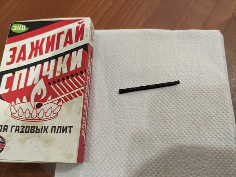 Спичка без зажигательной головки начала тлеть практически сразу, вот фото через 20 секунд.