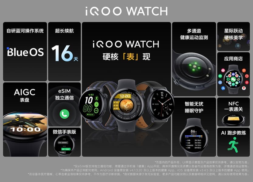 Программная платформа iQOO Watch — это BlueOS. Есть NFC, он позволяет использовать часы в качестве ключа для автомобиля. Ёмкость аккумуляторной батареи составила 505 мА·ч, автономность составляет от 7 до 16 дней на одной зарядке.
