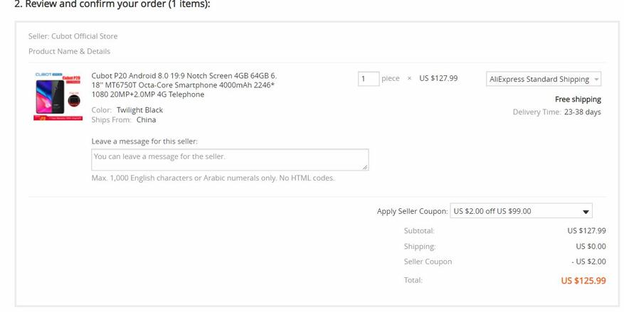 Страница заказа. Купон берется на странице товара: Cubot P20