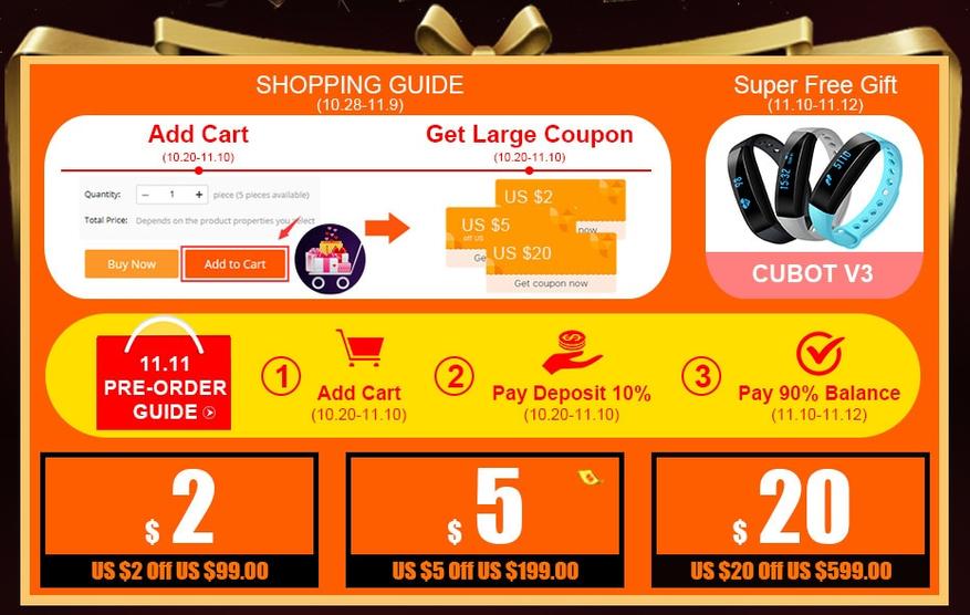 Здесь же 125$ + гарантия (с купоном и первичном взносе, правила на Ali). Из подарков — силиконовый чехол, возможность получить Cubot V3 смарт браслет бесплатно.