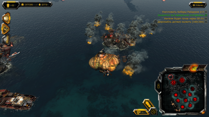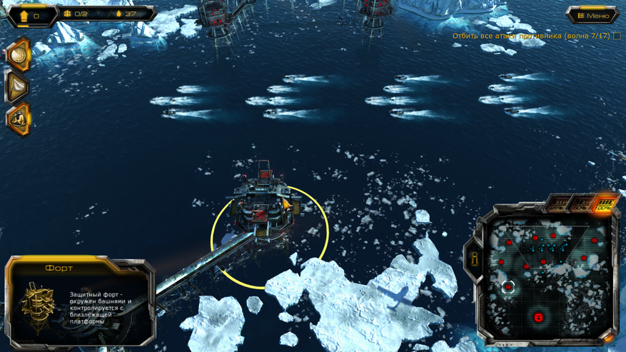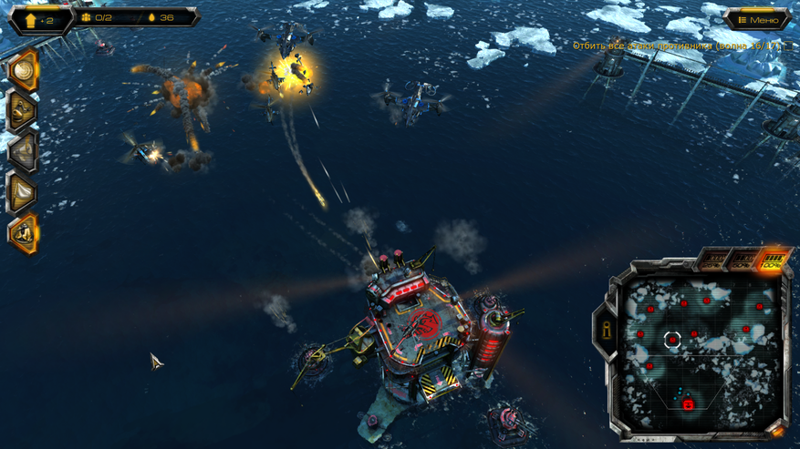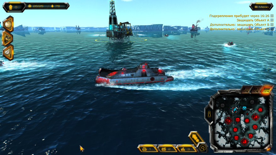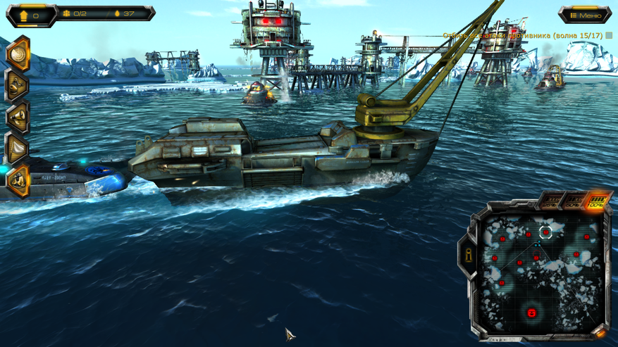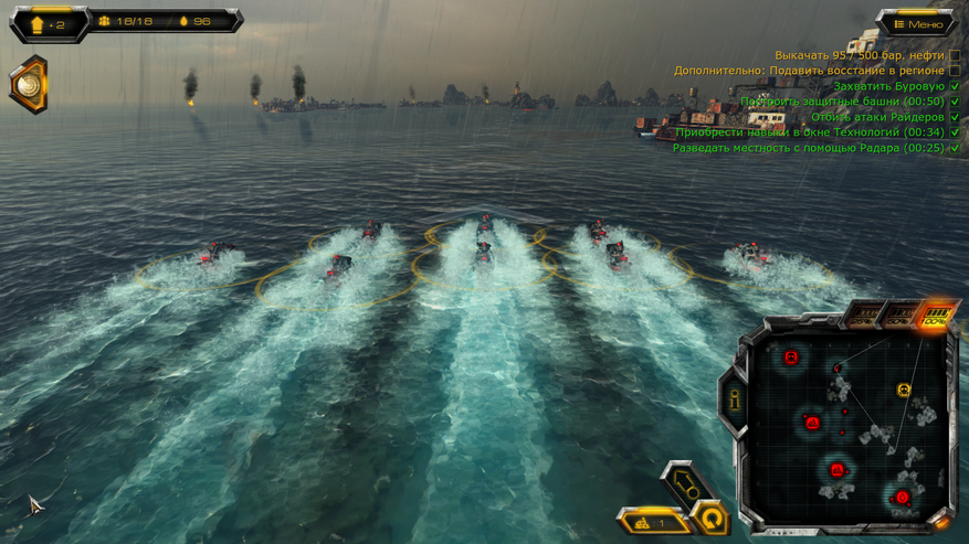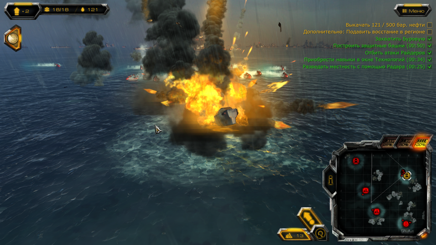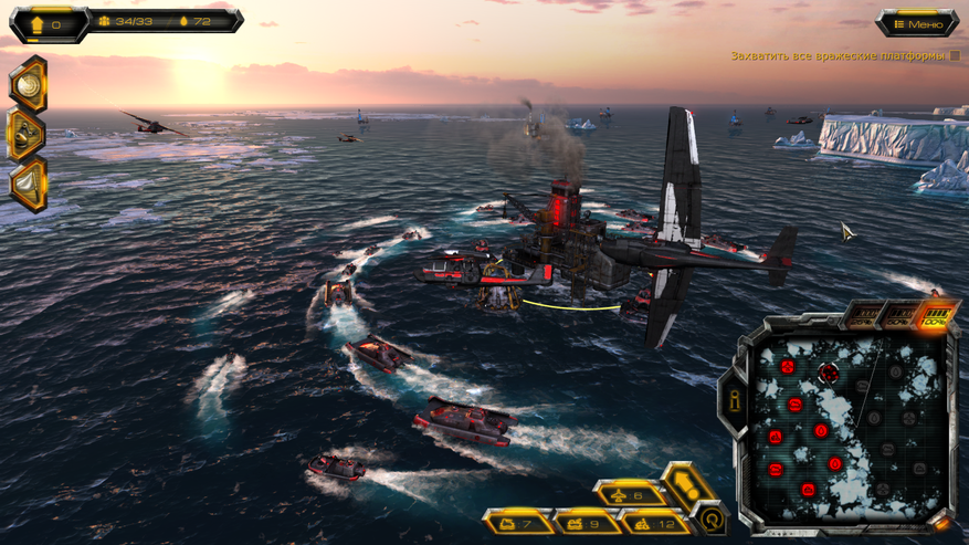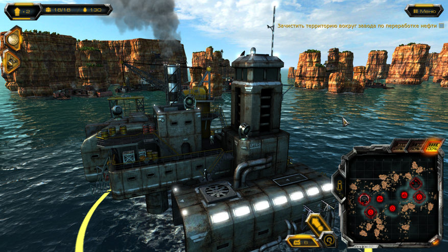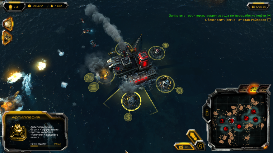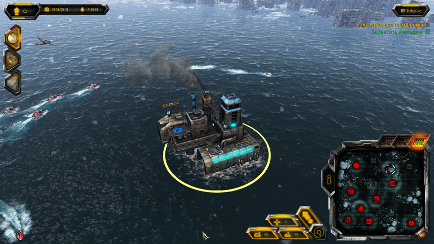 По сути в игре три ресурса. Нефть, которую придется тратить на использование различных умений и постройку обороны. Очки опыта, добываемые в бою или при захвате платформ. И время, которое придется тратить на ожидание постройки новых кораблей и самолетов.