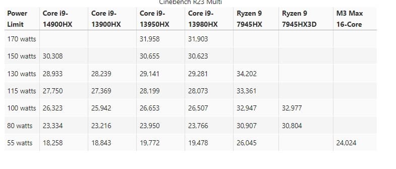 Отдельно стоит оценить энергопотребление. По энергоэффективности новинка Intel уступает флагманам AMD, хотя разница там тоже незначительная. Зато разница очень велика, если оценивать падение производительности при ограничении мощности. У флагмана Intel показатель падает с 30 308 баллов в Cinebench R23 при 150 Вт до 18 258 баллов при 55 Вт, а у Ryzen 9 7945HX имеет место падение с 34 202 баллов при 130 Вт до 26 045 баллов при 55 Вт.