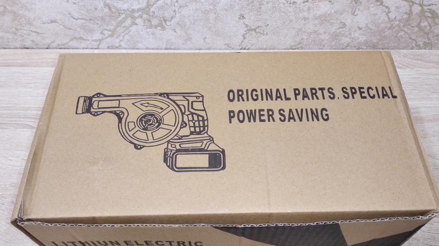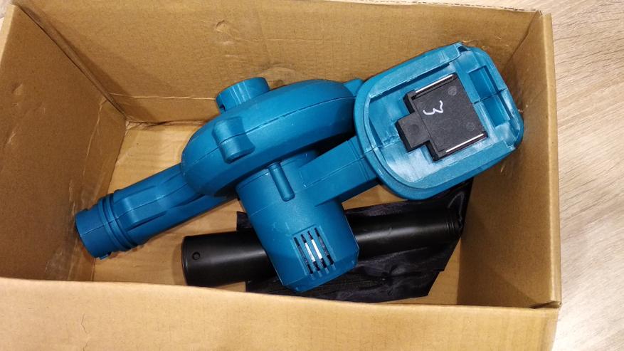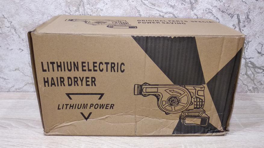 На коробке написано, что это литиевый сушитель волос, т. е. фен для волос аккумуляторный. Характеристик нет, но есть схематичное изображение. Внутри самый простой набор: воздуходувка, трубка и мешок. Руководства нет. АКБ нет, но у меня есть пара вариантов, один из них это взять совместимый АКБ от другого инструмента.