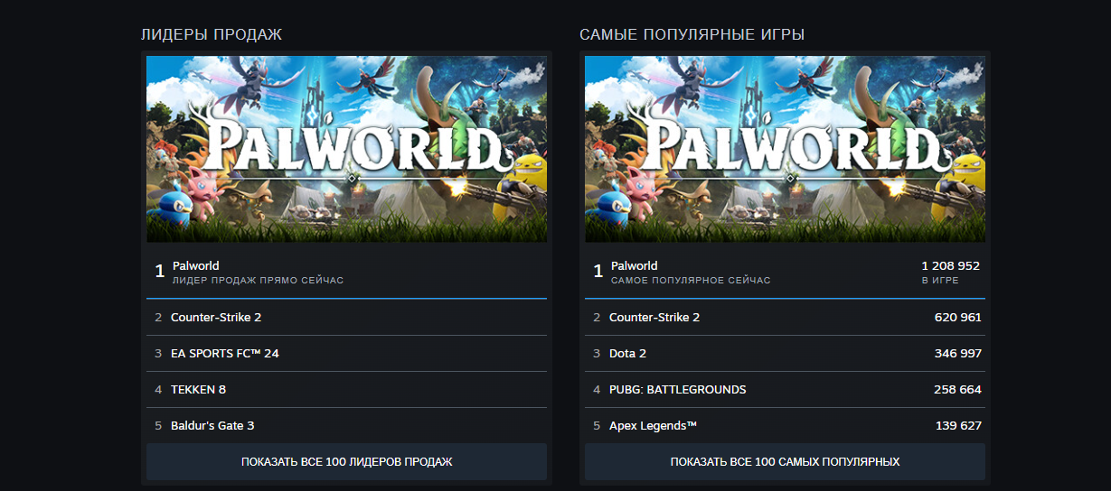 Позавчера Palworld была на втором месте в списке самых популярных игр, сегодня же она возглавляет рейтинг бестселлеров и игр с самым высоким количеством игроков в онлайне одновременно.
