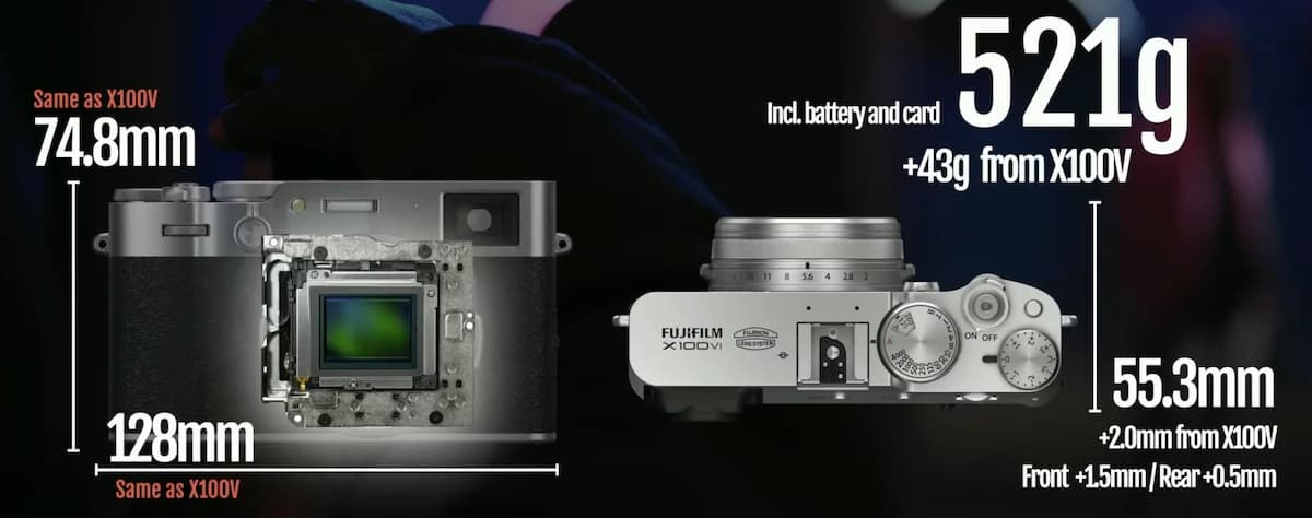 Fujifilm X100VI оснащена адаптерами Bluetooth и Wi-Fi, слотом для карт памяти SD UHS-II. Габариты – 128 x 75 x 55 мм, масса – 521 грамм.