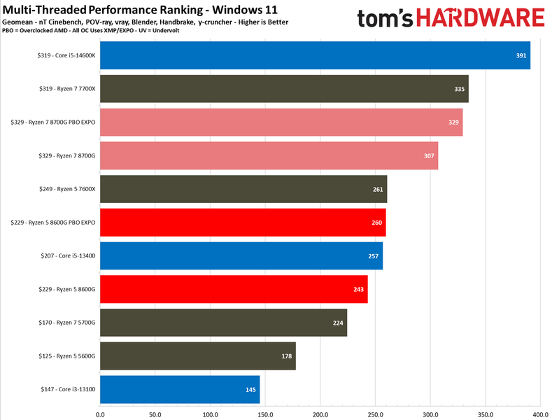Что касается приложений, тут шестиядерный Ryzen 5 8600G выступает почти на уровне чуть более дешёвого Core i5-13400 и чуть более дорогого Ryzen 5 7600X. При этом новинка быстрее восьмиядерного Ryzen 7 5700G и намного быстрее своего прямого предшественника.