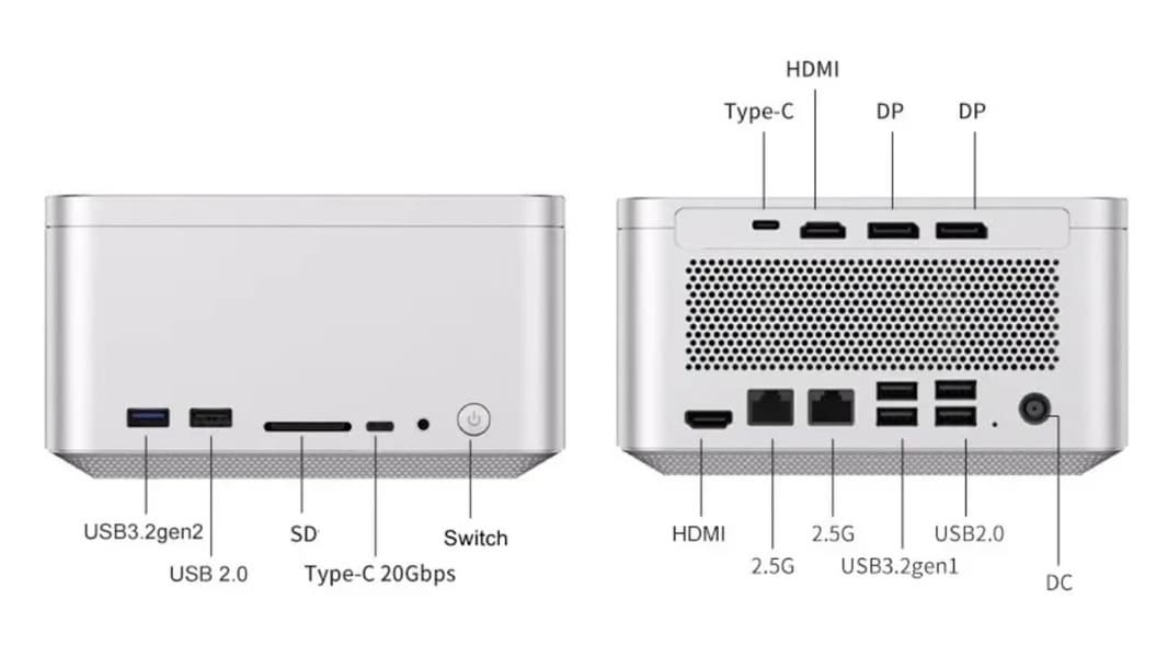 На системной плате внутри (модель чипсета не сообщается) — два слота для модулей оперативной памяти DIMM DDR5 (максимум ОЗУ — 64 ГБ), а также два разъема M.2 для установки твердотельных накопителей. Интерфейсные разъемы хорошо продемонстрированы на изображении ниже.