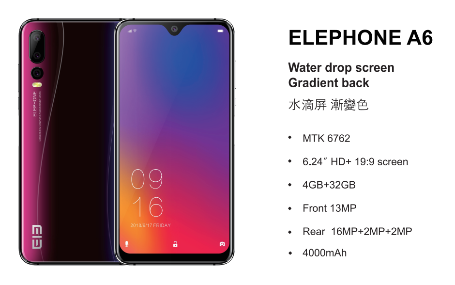 Смартфон Elephone A6 получил каплевидный вырез в экране под 13-мегапиксельную камеру, однокристальную систему Helio P22, экран диагональю 6,24 дюйма разрешением HD+, 4 ГБ оперативной и 32 ГБ флэш-памяти. Модули основной камеры имеют разрешение 16, 2 и 2 Мп. Емкость аккумулятора равна 4000 мА•ч.
