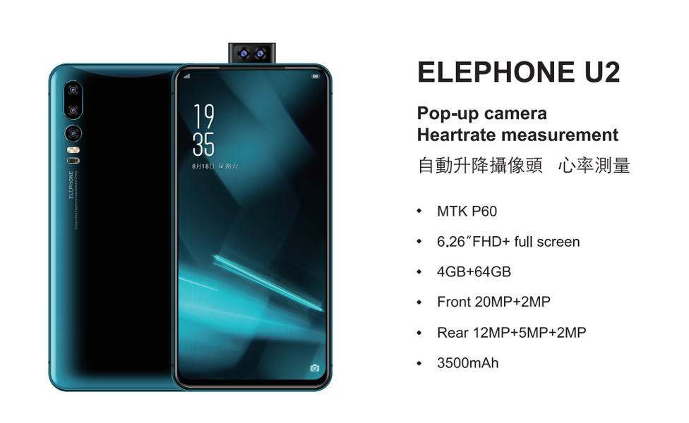В частности, была показана модель Elephone U2, которая оснащена выдвижной сдвоенной камерой для селфи, однокристальной системой Helio P60, экраном диагональю 6,26 дюйма разрешением FHD+, 4 ГБ оперативной и 64 ГБ флэш-памяти. Модули фронтальной камеры имеют разрешение 20 и 2 Мп, основная получила датчики изображения разрешением 12, 5 и 2 Мп. Емкость аккумулятора равна 3500 мА•ч.