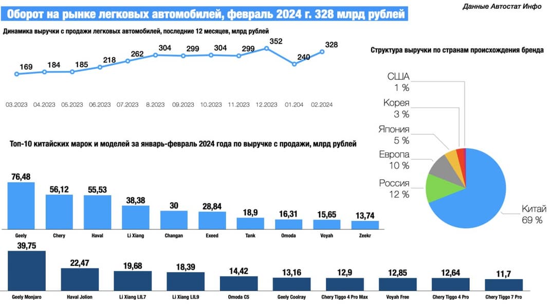 Аналитики «Автостат-инфо» подсчитали, что на покупку китайских авто россияне в текущем году (в январе и феврале) потратили 386,85 млрд рублей. Это 69% от объема всей выручки на российском авторынке за два первых месяца текущего года.