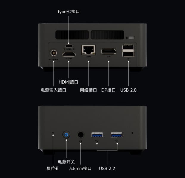 На передней панели Colorful CMHN01 — два порта USB 3.2 Type-A и аудиоразъем 3,5 мм, на тыльной панели — USB Type-C, HDMI, DisplayPort, два USB 2.0, RJ-45.