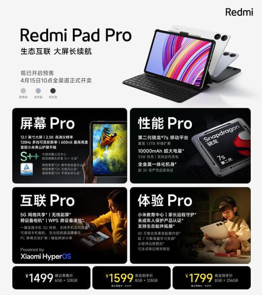 Вместе с Redmi Turbo 3 компания Redmi сегодня представила бюджетный планшет Redmi Pad Pro. Новинка крупнее ранее выпущенного Redmi Pad и получила экран повышенной яркости — 600 кд/кв.м. против 400 кд/кв.м. у Redmi Pad. Диагональ экрана — 12,1 дюйма, разрешение и кадровая частота — 2,5К и 120 Гц соответственно.
