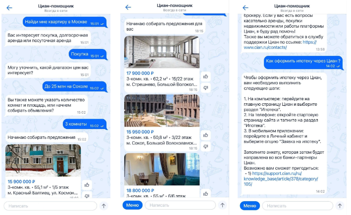 Команда «Циан» сообщила о запуске «первого в России среди классифайдов недвижимости» умного помощника — «ЦианGPT», который самостоятельно ищет по заданным текстовым параметрам подходящую недвижимость всех типов. Кроме того, «ЦианGPT» умеет отвечать на простые вопросы, которые обычно решает служба поддержки.
