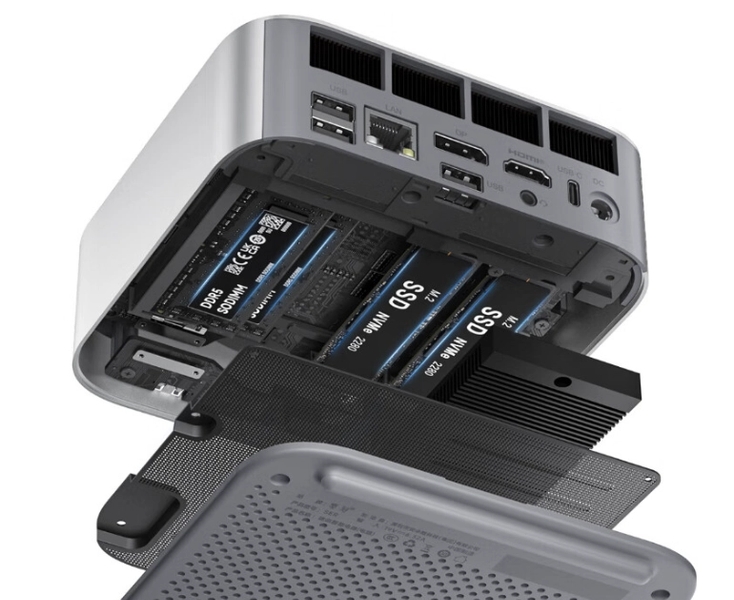 Новинка оснащена процессором AMD Ryzen R7 8845HS, имеет два слота для оперативной памяти DDR5 5600 МГц (источник пишет про 256 ГБ, но, вероятно, это ошибка) и слоты для двух SSD-накопителей ёмкостью до 8 ТБ.