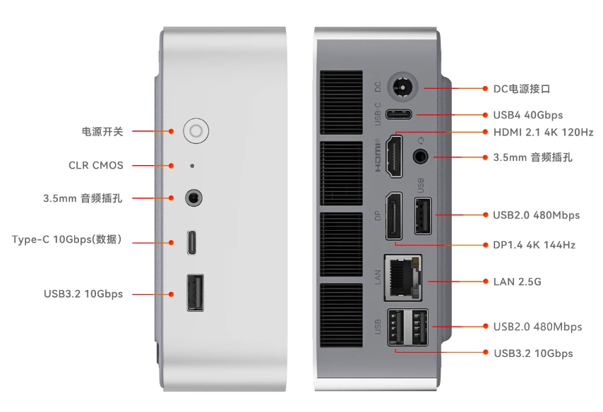 Кроме того, мини-ПК также оснащён полнофункциональным интерфейсом HDMI 2.1, DP 1.4, USB4, поддерживающим дисплей 4K/144 Гц.