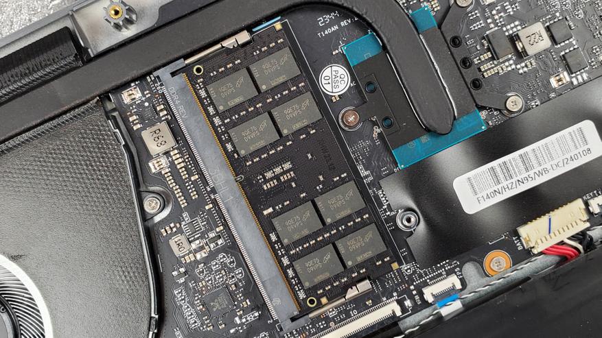 Разберем и посмотрим внутреннее устройство. Компоновка классическая. Справа материнская плата с чипсетом, памятью и обвязкой. Система охлаждения с вентилятором расположена левее. А внизу массивный аккумулятор, по обеим сторонам от которого разместили аудио динамики.