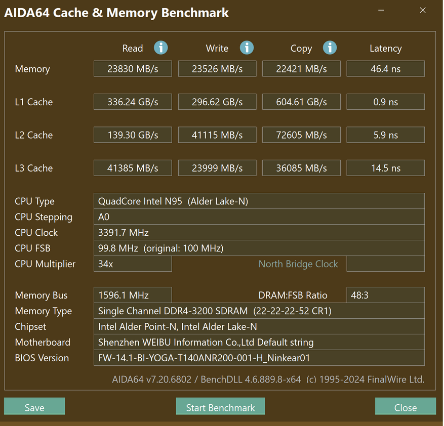 Чтобы сравнить производительность с предыдущими платформами и узнать насколько сильно выросла производительность, провел тестирование предыдущей версией бенчмарка, а именно Geekbench 5. Здесь получил 996 баллов в режиме одного ядра и 2587 в многоядерном режиме. Как для бюджетного процессора это очень неплохой результат. Для сравнения, вот результаты тестов бюджетных ноутбуков прошлых лет: Chuwi HeroBook Pro на Intel N4000 набрал в этой версии теста 423/762 баллов, мини-ПК M1T на Celeron J4125 набрал 438/1437 баллов, а компьютер Сhatreey AN1 на Ryzen 5 3550H набрал 876/2876 баллов. Т. е фактически производительность сравнялась с райзенами 4 летней давности и на мой взгляд это довольно приличный результат для офисной/домашней/мультимедийной машинки.