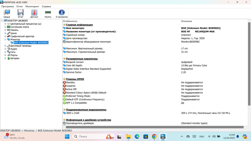 Посмотрим какая матрица используется в ноутбуке, в этом поможет утилита Monitor Asset Manager. Как видим установлена 10 битная панель BOE0982 NE140QUM-N6A.