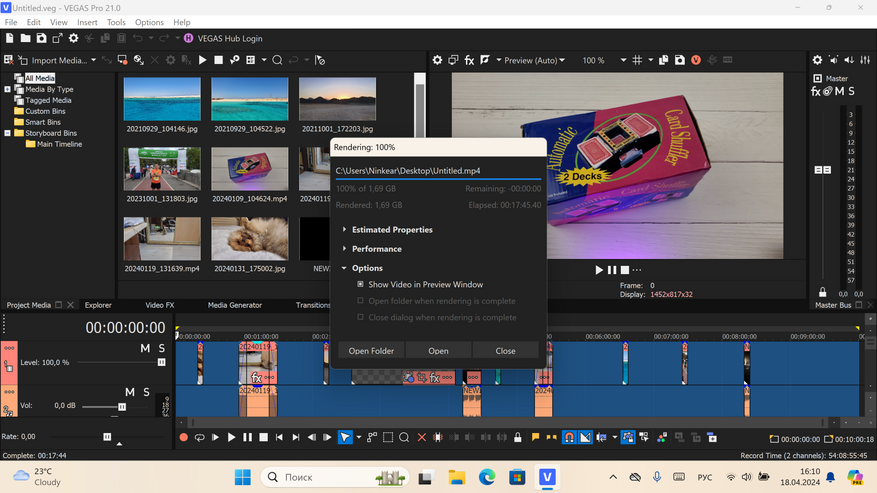 Даже с 4К разрешением не возникло проблем при рендеренге. 10 минутный проект был обработан за 17 минут 45 секунд. Для сравнения, у ноутбука на процессоре AMD Ryzen 7 5700U с применением технологии ускорения AMD VCE ушло 19 минут 27 секунд. Т. е гораздо более мощный ноутбук справился с задачей даже хуже. О чем это говорит? Скорее о превосходстве Intel в вопросе обработке видео. Ну и о том, что Ninkear N14 справляется с этими задачами на отлично.
