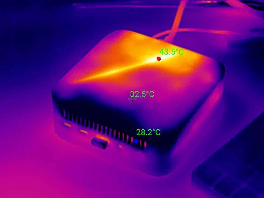 Благодаря небольшому тепловому пакету компьютер не требует громоздкого шумного охлаждения и не перегревается под нагрузкой. Термограмма наглядно показывает точку с наиболее высокой температурой (район процессора). Воздух забирается системой охлаждения через лицевую решетку, охлаждает внутреннее пространство и выдувается с противоположной стороны. Под высокой нагрузкой корпус нагревается до приемлемых 43 — 44 градусов, при стандартной нагрузке — до комнатной температуры. Еще раз акцентирую внимание, что активная система охлаждения здесь очень тихая. С легкой нагрузкой, вроде чтения интернет страниц, она даже не включается. Если работаете в ресурсоёмких приложениях может включиться на низких оборотах или средних оборотах, но ее едва слышно, как легкий шелест. На максималках (обычно это игры) слышно сильнее, но никаких завываний.