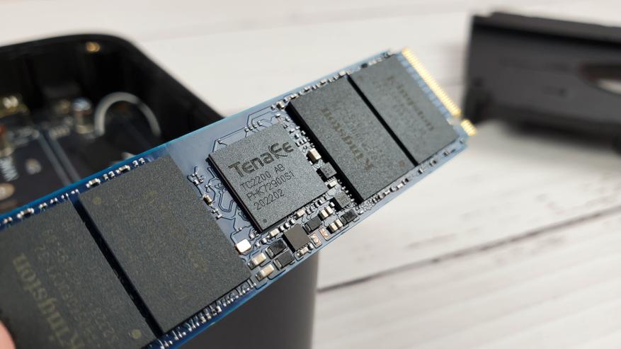 Наклейку я удалил, чтобы посмотреть на чипы. Да и охлаждение это улучшит, так как наклейка здесь самая обыкновенная. Контроллер Tenafe TC 2200 работает с SSD без DRAM, поддерживает интерфейс PCIe Gen4, NVMe 1.4 и максимальную производительность до 4,8 GB/s. Работает он в тандеме с памятью Kingston FB25608UCY1-32.