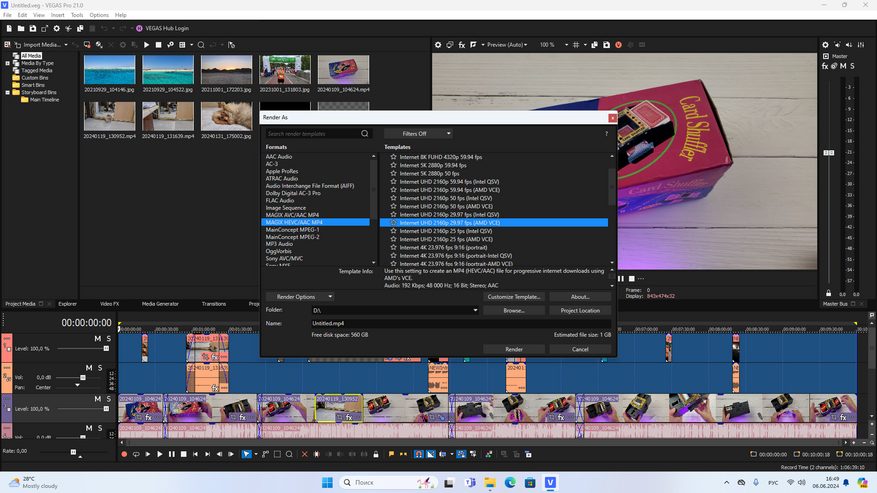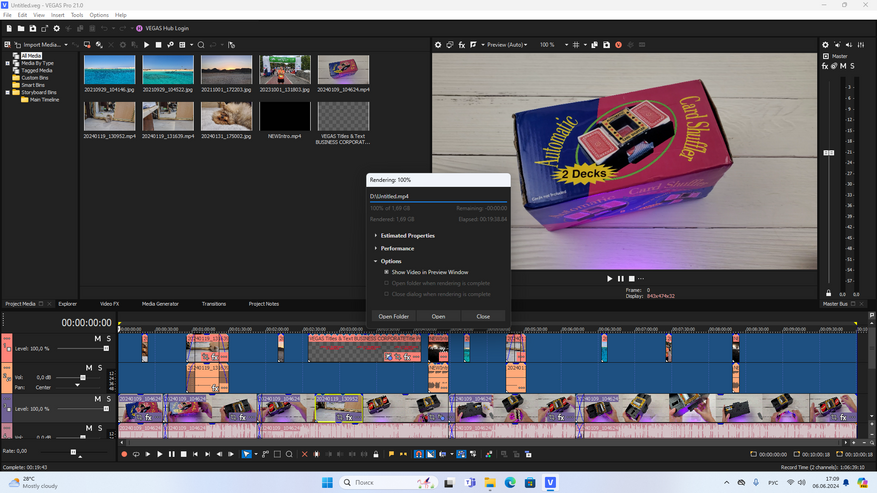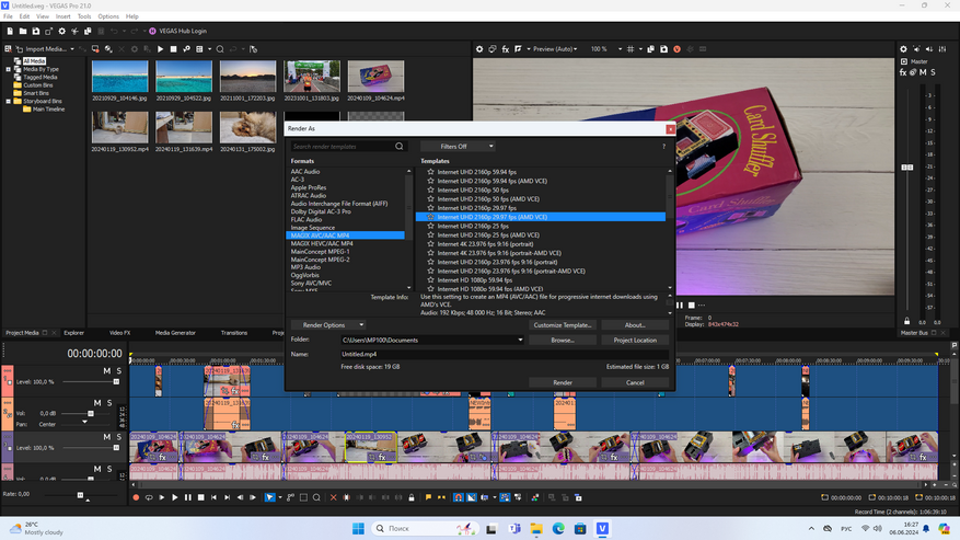 Следующим делом я проверил возможности компьютера в вопросе рендеринга (видео монтажа). Для этого создал тестовый проект в приложении Magic Vegas в 4К разрешении продолжительностью 10 минут. В проекте использовал склейки, обрезки и наложения, добавление текста и различных эффектов. Компьютер поддерживает технологию ускорения AMD VCE. С кодеком AVC процесс кодирования занял 20 минут 27 секунд.