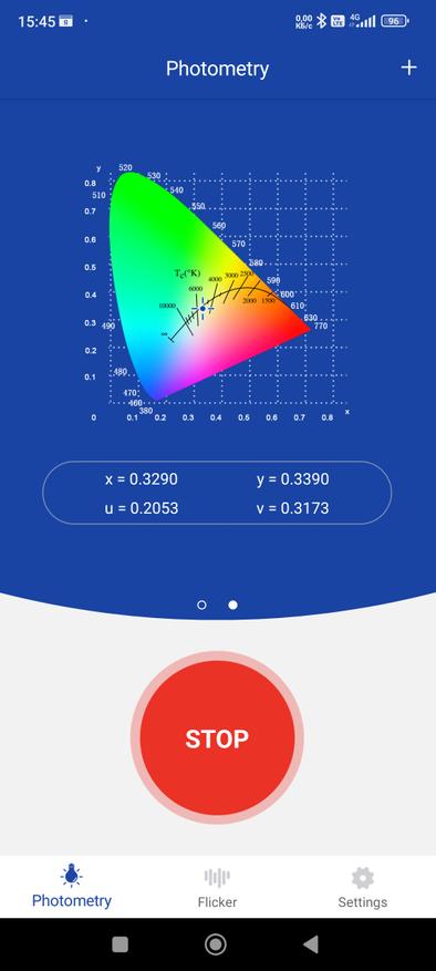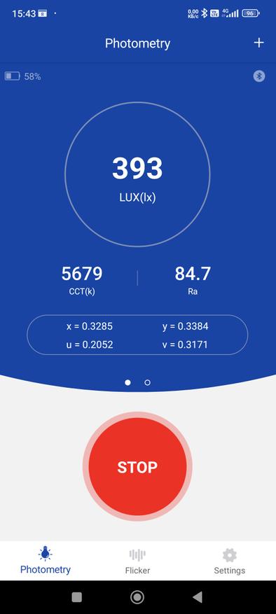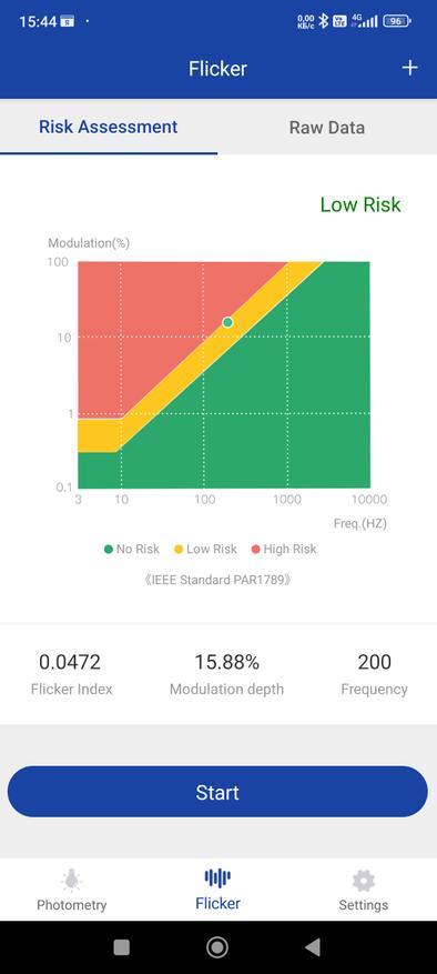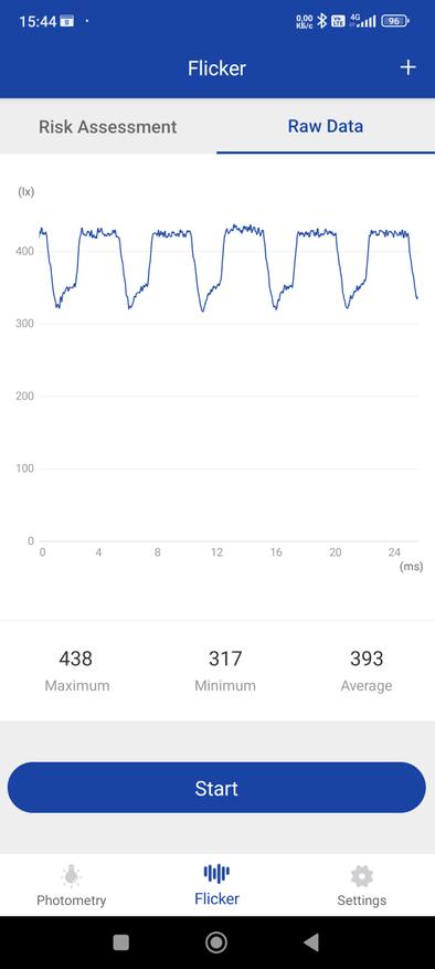Следующим этапом стала проверка матрицы с помощью устройства OPPLE Light Master III. На приводимом изображении можно увидеть, что значение яркости находится на приличном уровне. Хотя широтно-импульсная модуляция работает в пределах допустимого и не должна вызывать сильного дискомфорта (у меня за время тестирования никаких намёков на него не было), всё же хотелось бы видеть её значения попадающими в зелёную область графика.