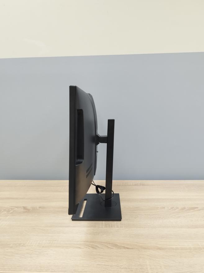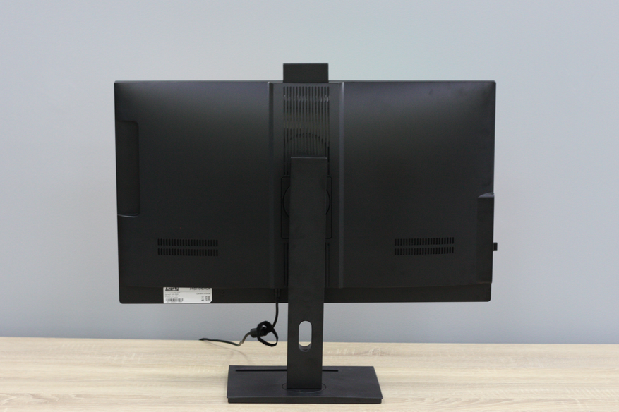 Сборка моноблока не составляет совершенно никаких проблем. Используя невыпадающий (с накаткой) винт с полукольцом, рукой, без отвёртки, фиксируем основание на ножке. После чего, с помощью подпружиненного переключателя, прищелкиваем ножку к задней части экрана. Далее подключаем блок питания, клавиатуру, мышь — и систему можно запускать. Развернув моноблок на себя и подстроив по высоте, невольно начинаешь любоваться выверенным дизайном корпуса. Фактура материала, как и заявлено в описании товара производителем, действительно практичная — отпечатки почти незаметны. Черная вставка внизу экрана поблескивает металлической гранью, добавляя изысканности. Нижняя часть подставки имеет продолговатую выемку, служащую держателем смартфона, что не только удобно, но и показывает определенный уровень проработки дизайна (если не можете отсечь что-нибудь лишнее, то добавьте функций).