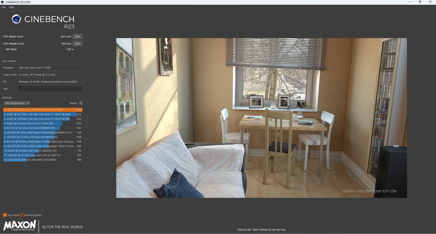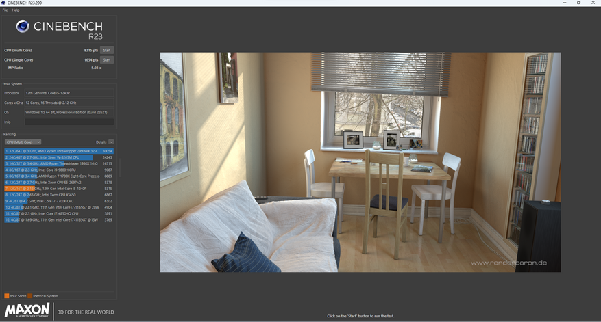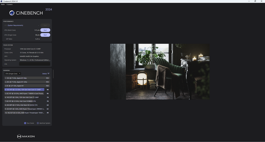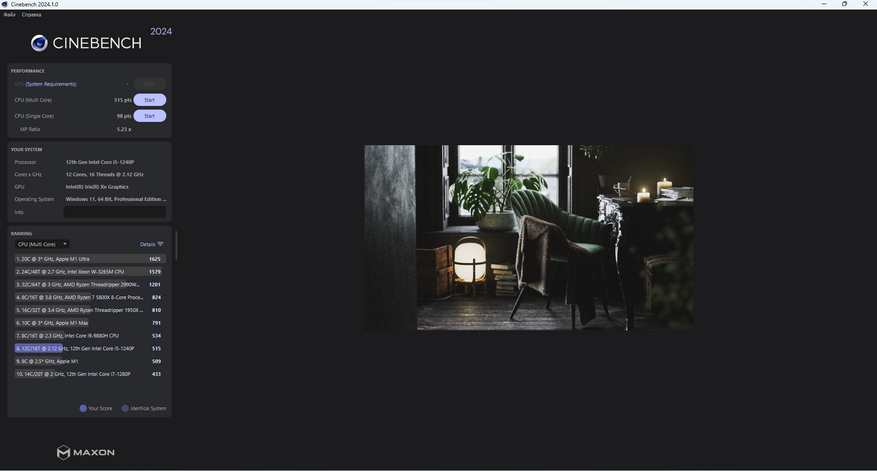 Замер производительности процессора в рендеринге трехмерных сцен провел с помощью программы CineBench в версиях R23 и 2024. Хотя сейчас мало кто занимается обсчетом 3D-сцен с помощью процессора — в основном для этого используют видеокарты, но эта программа неплохо отражает результат общей производительности данной системы по отношению к другим.