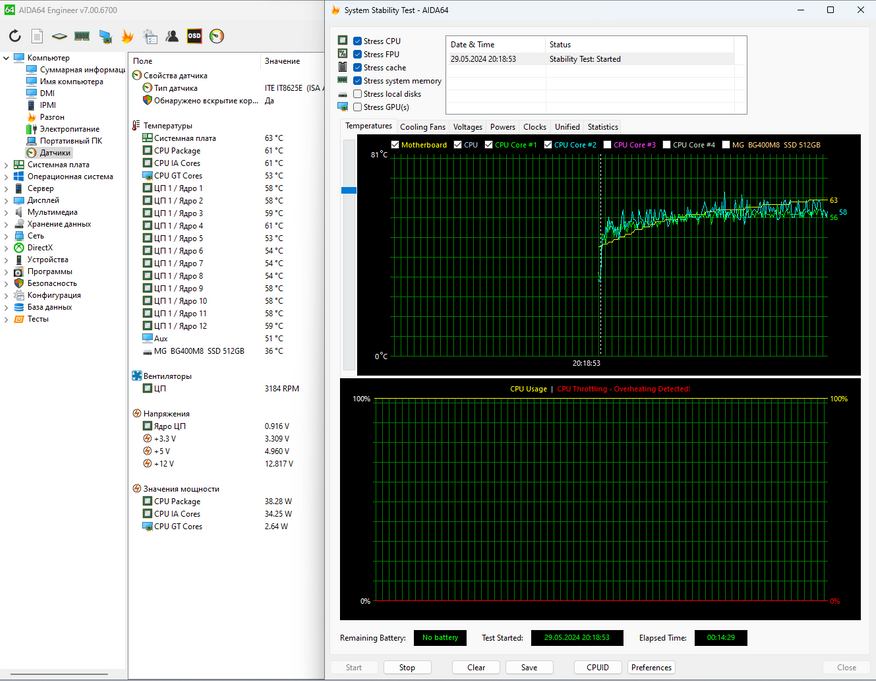 Сверив характеристики с заявленными, запустил программу Aida 64. Бегло глянув на вкладку значений температуры, поспешил запустить тест стабильности системы. Цифровой термометр на столе показывал 26 градусов.
