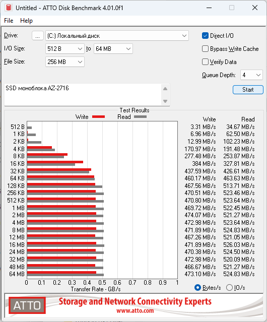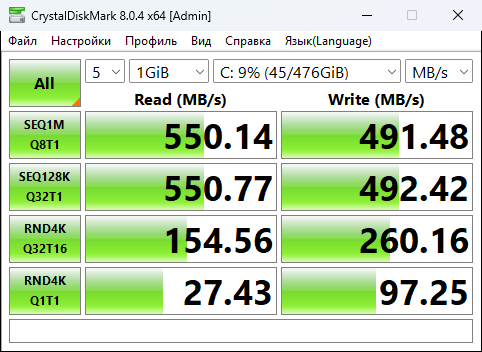 После произвел замер скорости работы твердотельного диска с помощью программ CrystalDiskMark и ATTO Disk Benchmark. Раньше я бы написал про отличные результаты, но с появлением SSD формата NVMe полученные итоги можно назвать лишь хорошими или даже посредственными.