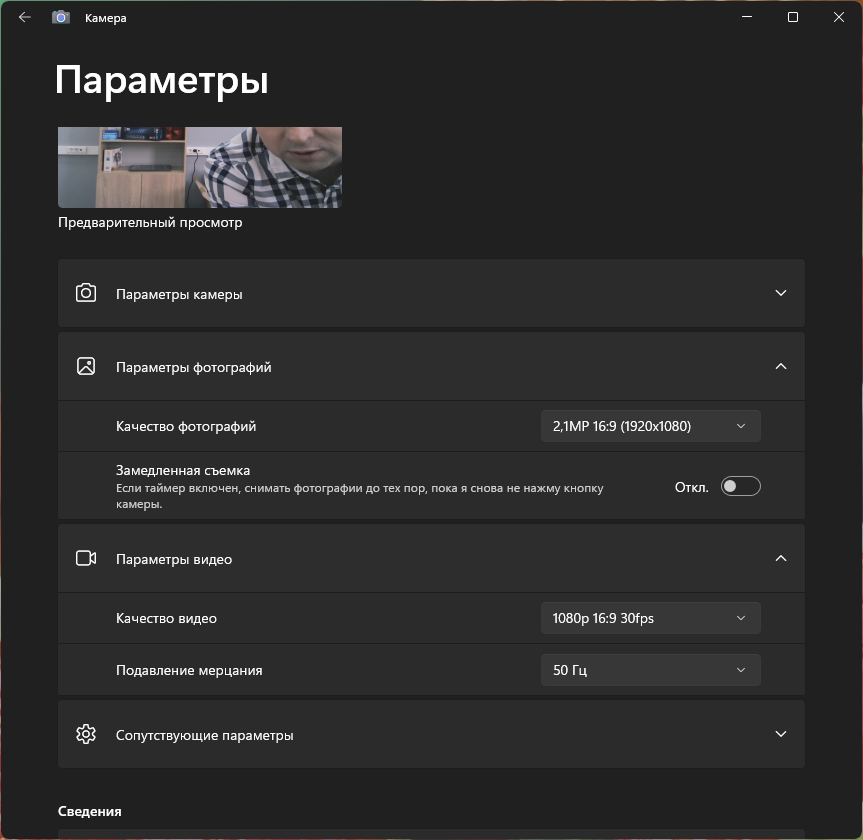 Также стоит немного задержаться на веб-камере моноблока. Здесь она, будучи подпружиненной, после нажатия выдвигается вверх, в рабочее положение, остальное время прячась внутри корпуса. Разрешение камеры, как можно увидеть ниже, 2,1 Мпикс, видеопоток она способна записывать в разрешении 1080р, с частотой 30 кадров/сек. Я нахожу качество изображения встроенной камеры приемлемым для видео-общения, и результат её использования должен устроить пользователя, не предъявляющего повышенных требований к съёмке.