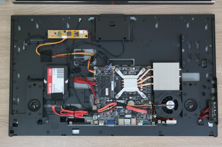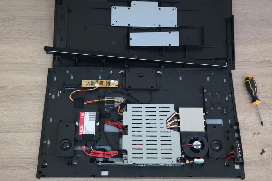 После снятия задней крышки, нашему взору открывается перфорированная пластина, заботливо укрывающая материнскую плату. По обеим сторонам от неё расположились относительно крупные динамики, мощностью в 5 ватт каждый. Слева «приютился» SSD формата 2,5 дюйма ёмкостью 512 Гбайт. В верхней части мы видим плату управления питанием матрицы, а справа от неё — спрятанную выдвижную веб-камеру.