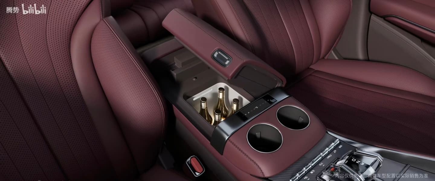 На передней панели Denza Z9 GT разместились три экрана, центральный — большой. Также предусмотрено два холодильника, они спрятаны в передний и задний подлокотники. Каждый из холодильников — со своим компрессором.
