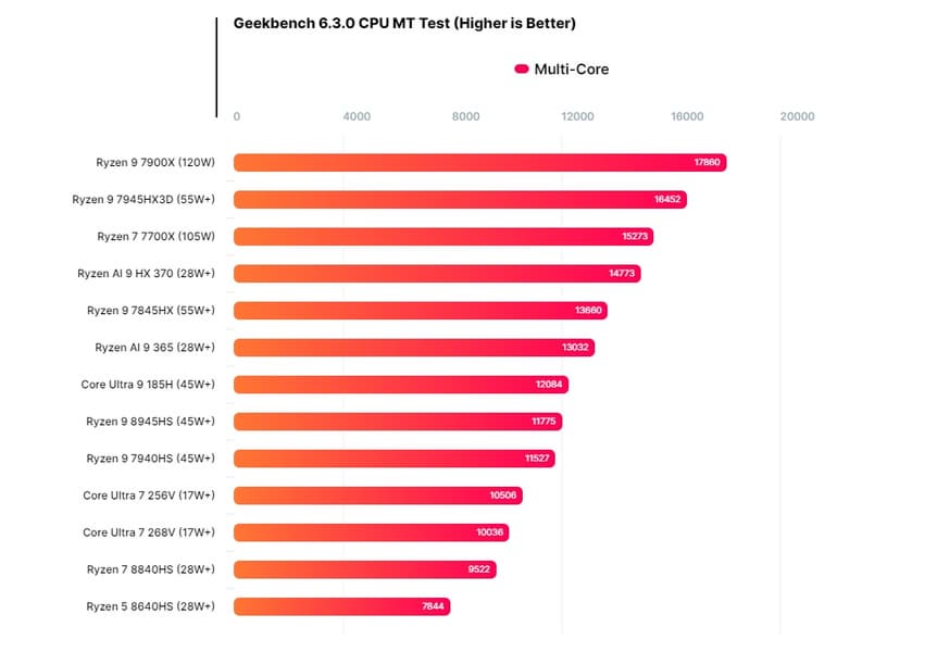 В первом случае это результат уровня 55-ваттного Ryzen 9 7845HX, при этом новинка Intel представляет собой 17-ваттный процессор. Преимущество над 45-ваттным Core Ultra 9 185H составляет 16%. В многопоточном же режиме новинка Intel при своих 17 ваттах опережает 28-ваттный Ryzen 7 8840HS, но не дотягивает до 45-ваттного Ryzen 9 7940HS. Тот же Core Ultra 9 185H теперь уже впереди на 15%, но это почти при трёхкратной разнице в TDP.