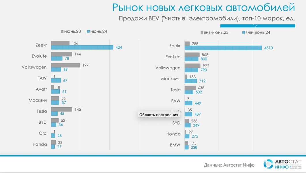 Абсолютным лидером в сегменте является Zeekr: за первое полугодие в России продано 4510 машин этой марки, в 15,65 раза больше, чем в первой половине 2023 года. На втором месте отечественный бренд Evolute, и тут фиксируется падение продаж: в первой половине 2023 года было продано 868 «Эволютов» против 800 единиц в первой половине 2024 года. Третье место у Volkswagen, но тут тоже заметное падение продаж: 790 машин продано в первой половине 2024 года против 922 машин в первой половине 2023 года.