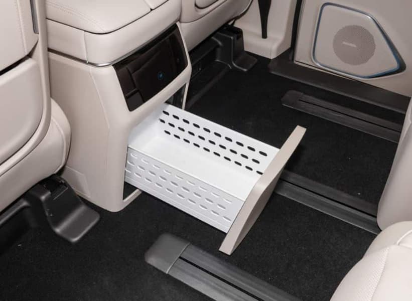 Еще одна особенность автомобиля — 12,5-литровый холодильник, вмещающий до 14 бутылок (объём не указан). Он может поддерживать фиксированную температуру в течение 24 часов, даже когда автомобиль не движется.