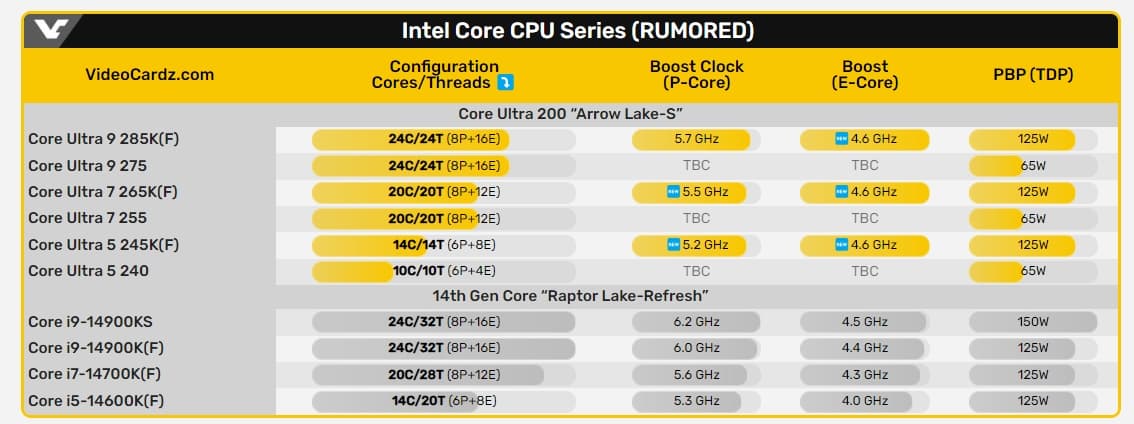Флагманский Core Ultra 9 285K предложит частоту 5,7 ГГц, что уже на 300 МГц ниже, чем у Core i9-14900K. Частота Core Ultra 5 245K составит 5,2 ГГц, что на 100 МГц ниже, чем у Core i5-14600K.