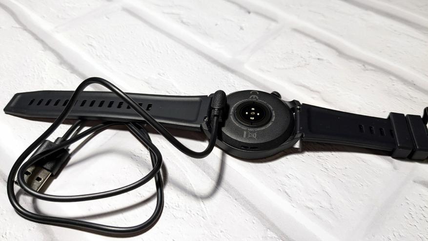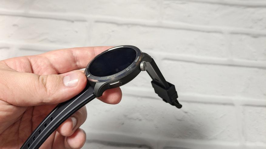 Встроенный 300 mAh аккумулятор заряжается с помощью комплектного провода. Достаточно примагнитить один конец кабеля к задней площадке часов. Как только подключается провод — часы сразу же запускаются, а на экране отображается заряд аккумулятора в процентах.