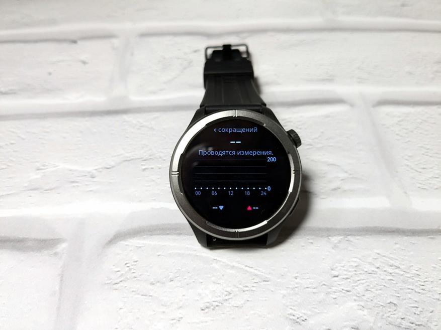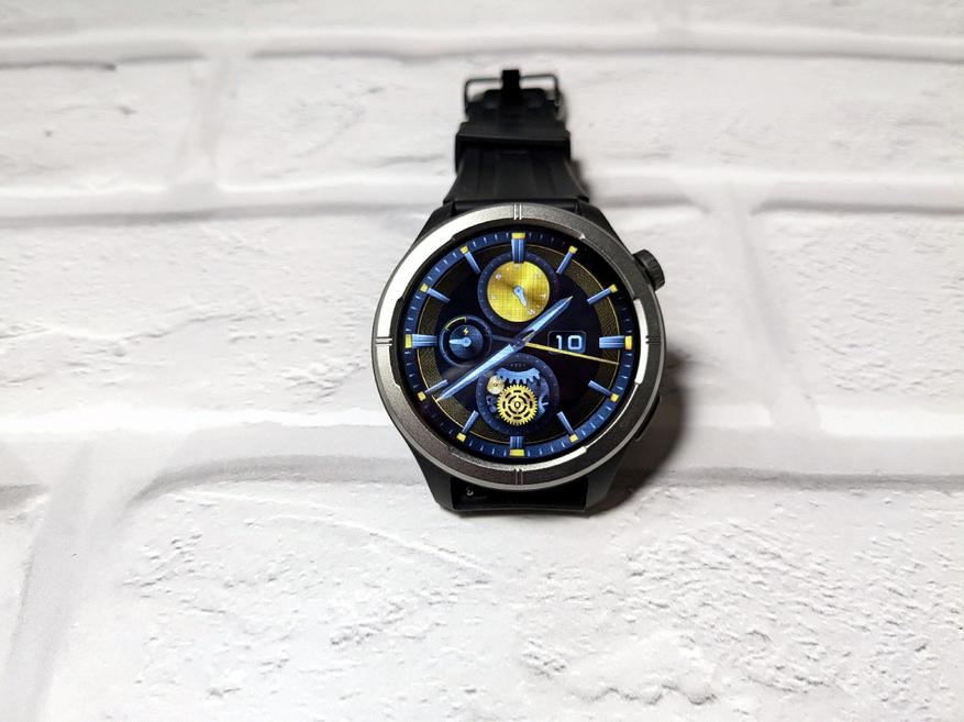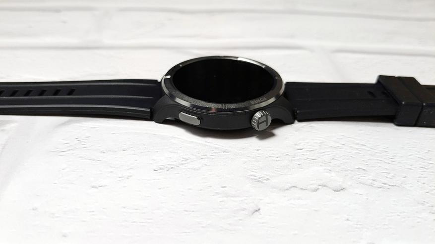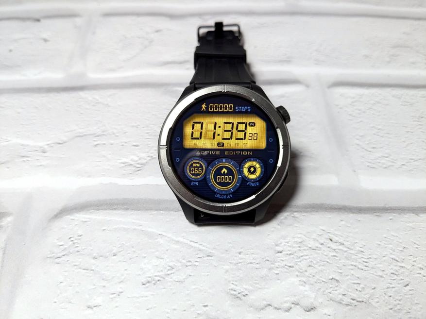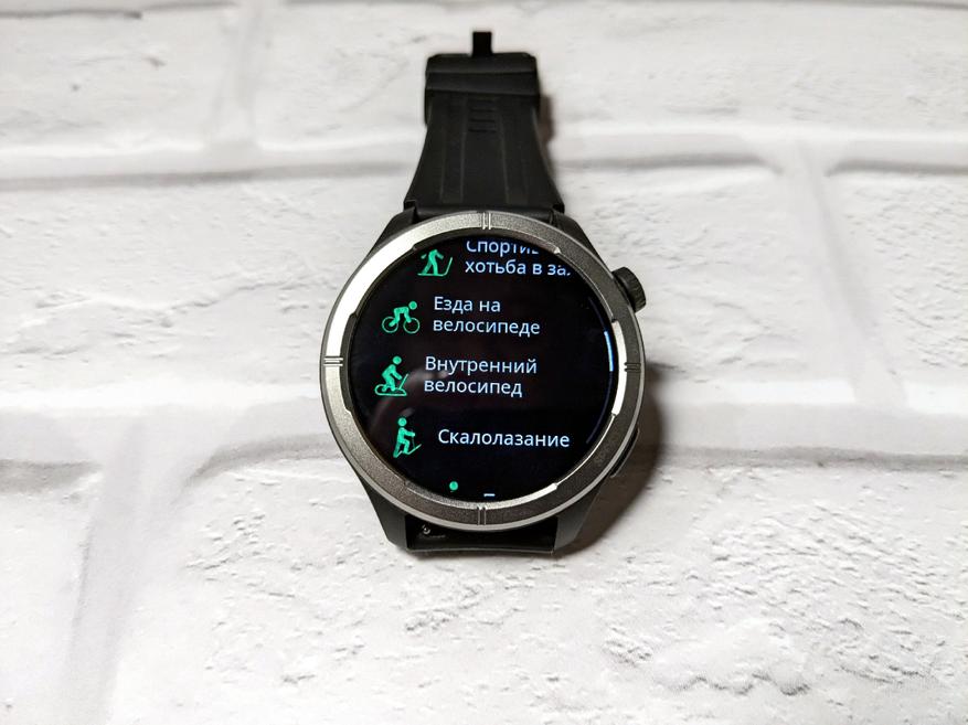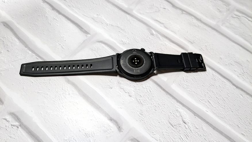 Дисплей, как обычно, прикрыт стеклом. Основная часть конструкции и задняя площадка с датчиками сделаны из пластика. На серебристой металлической вставке можем видеть обозначения «power» и «sport». Power — многофункциональное «колесо» с накаткой. Колесико позволяет прокручивать циферлблаты, списки, включать и выключать часы, перемещаться по меню. Все функции колеса дублируются сенсорным дисплеем. Нижняя кнопка уже без прокрутки — статичная, для быстрого входа в меню спортивных режимов. Качеством сборки я доволен — конструкция цельная и надёжная. Есть влагозащита IP68, позволяющая топить часы на глубине до 1.5 метра на определённое время.