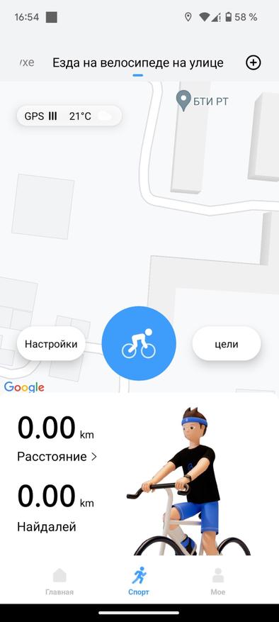 На месте функция обнаружения, помогающая определить местоположение часов. Можно настроить мониторинг здоровья, выставить различные напоминания. Спортивные режимы дублируются на специальной вкладке, где так же отображается полноценная карта с навигацией. Приложение считает шаги, километры, запоминает активность.